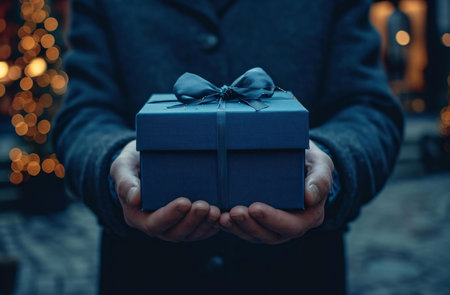 A man holds a beautifully wrapped blue gift box, with a big blue bow, in front of a blurry background of christmas lights. The image evokes feelings of joy and generosity.