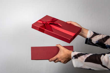 Close-up view of hands of unrecognizable mature man holding red gift box tied to bow. Giving gifts during the Christmas, Happy New Year and Happy Birthday at office.