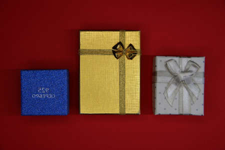 Three multicolored gift boxes on the red background