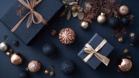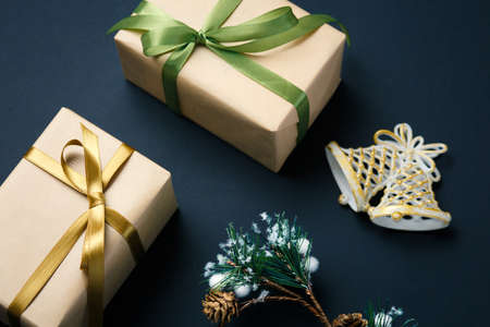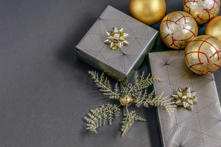 Christmas and New Year handmade wrapping gift boxes, golden ribbons, balls and baubles on the black background. Modern decoration in gold-black colors.