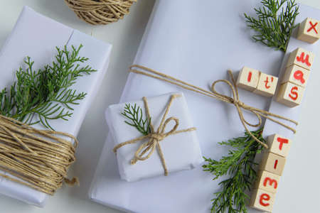 Top view of white handcraft gift boxes with It's x mas time text (wooden letters) and fresh fir branches on white background, seasonal celebration and eco-friendly concept
