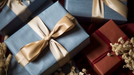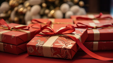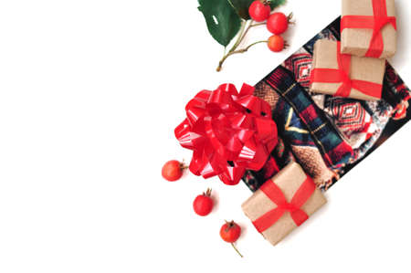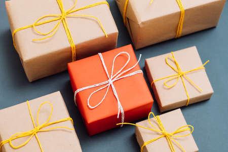 holiday presents delivery. selection of gifts packed in red and craft paper and tied with twine. celebration gratitude and congratulation concept.