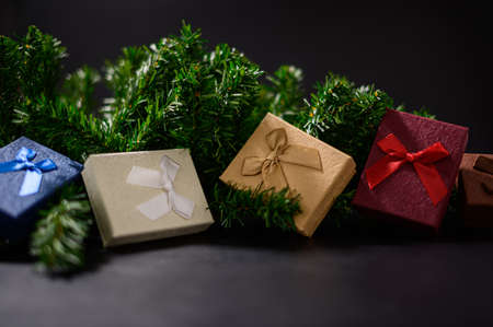 Colorful gift boxes on black background. Christmas and New Year concept.