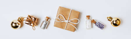 Christmas holiday gift box on decorated festive table with sparkle stars on white background. Packaging gift wrap and ribbons, twine. Winter time new year