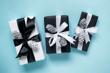 Winter Christmas backgound with three gift boxes presents wrapped in black paper with satin bows and white wooden pine cones on blue backgound.
