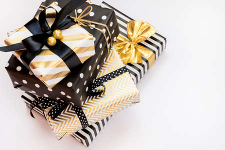 Top view of a heap of gift boxes in various black, white and golden designs. A concept of Christmas, New Year, birthday celebration event.
