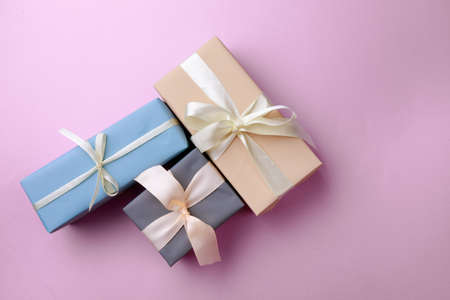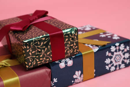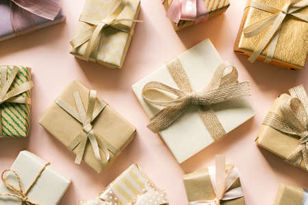 Various gift boxes on pink background. Christmas, greeting, anniversary concept. flat lay, top view