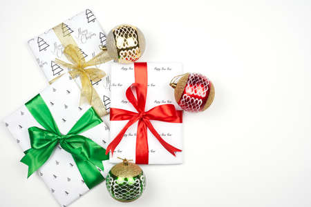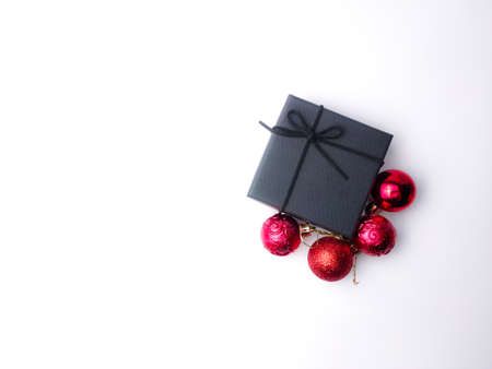 Christmas red ball and gifts box on a white background. Holidays christmas background. Copy space for text or design.