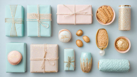 Discover a delightful arrangement of colorful gift boxes, pastries, and sweets on a soft mint background, perfect for celebrations, parties, and special occasions.
