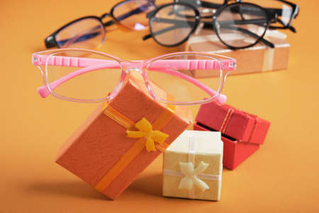 pink glasses for girls on small gift boxes, small gift boxes on a brown background copy space, discounts and promotions in the optics store