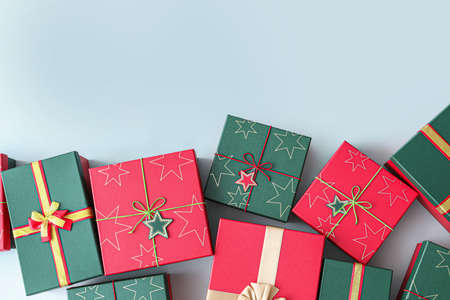 Top view of presents wrapped in paper with red ribbon and placed on table with glittering golden stars