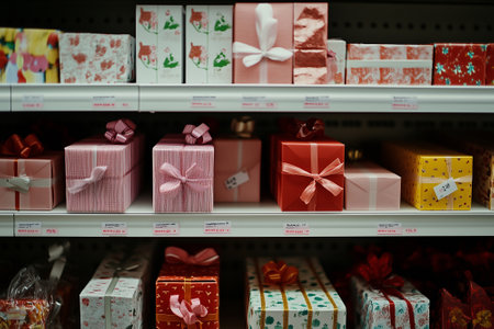 Stacks of gift boxes on shelf in supermarket. Holiday celebration. By generative Ai