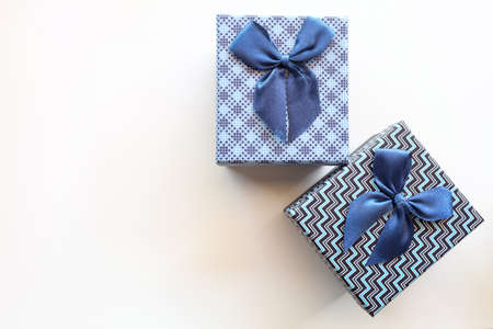 Beautiful small boxes with gifts on a turquoise background. Space for text.