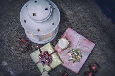 Festive concept for Christmas and New Year. A beautiful decorative lamp glows on a dark background with gift boxes, drums and a wooden Christmas tree