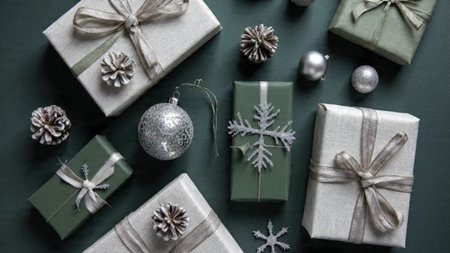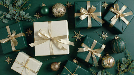A top-view festive arrangement with silver snowflakes scattered over a matte green backdrop and neat gift boxes on each side.