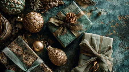 Rustic winter composition with textured emerald wood and antique gold ornaments.