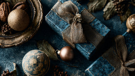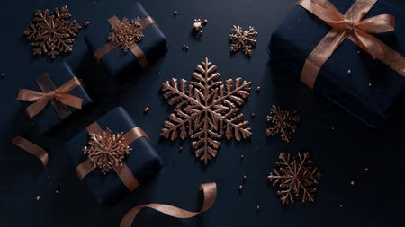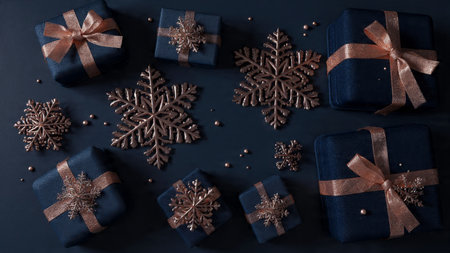 A shimmering rose-gold holiday layout arranged atop a smooth deep-blue background for elegant contrast.