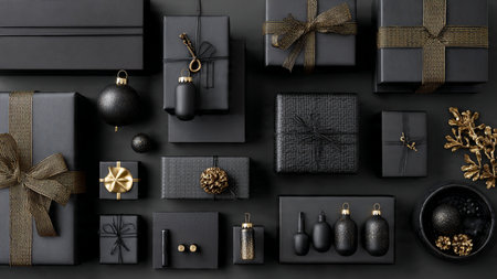 AI Generated. Elegant Black and Gold Gift Boxes for Festive Celebrations