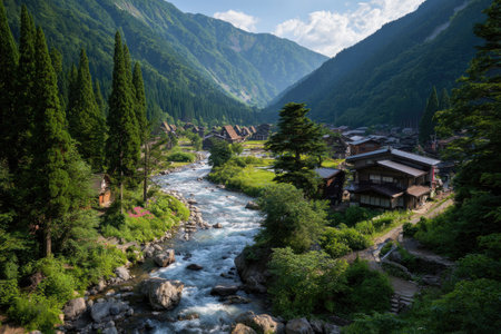 The scenic village of Shirakawa-go is nestled in lush green mountains, featuring traditional gassho-zukuri houses and peaceful countryside life. Japan