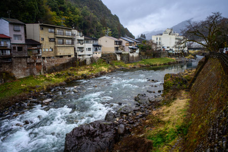 Natural river and green mountain of Gero onsen hot spring resort town in Gifu, Japan - autumn season