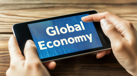 A close-up of hands holding a smartphone displaying the text Global Economy. This image symbolizes modern communication and financial trends in a digital world.