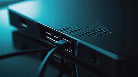 This close-up image showcases a USB connection on a modern device, highlighting its sleek design against a dark background. Perfect for technology-related projects.