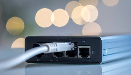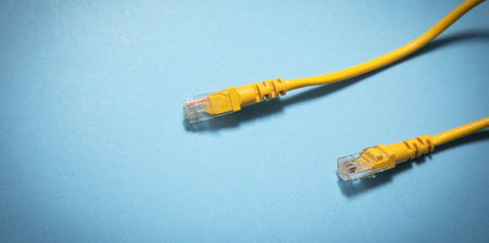 This close-up image features a glowing Ethernet cable connector, illustrating the technology behind digital communication. Perfect for tech-oriented themes.