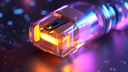 AI generated 3d image of an electronic twinkle device on a reflective surface illuminated by neon light.