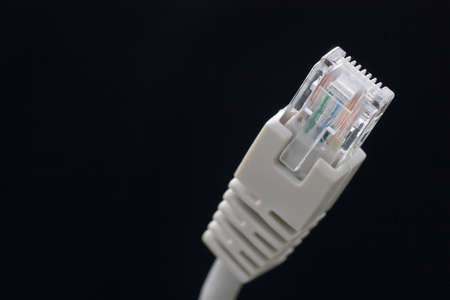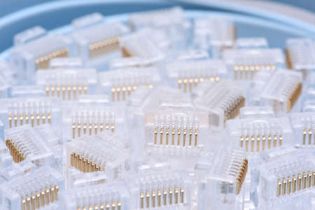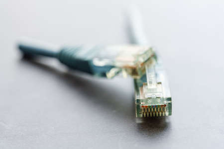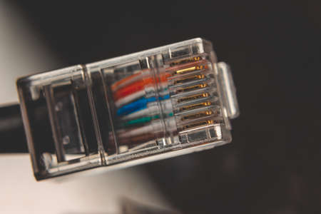 plastic connector RJ 45 for connection to a computer network, macro abstract background
