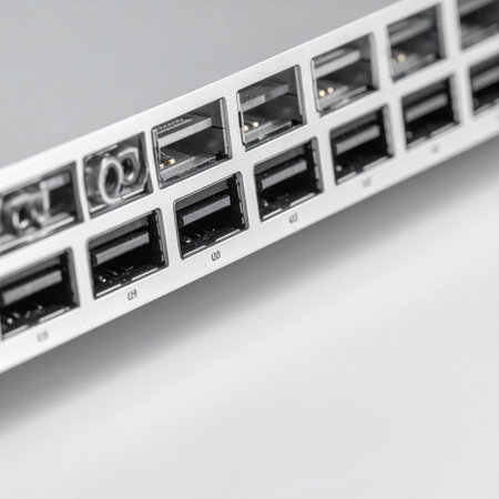 A sleek, monochrome close-up of a multi-port USB hub on a server rack.