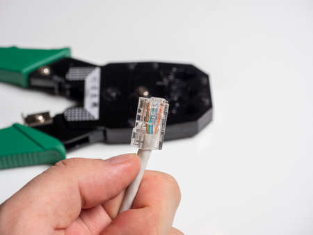 a man is holding a communication cable for connecting the Internet. In the background, cable crimping pliers