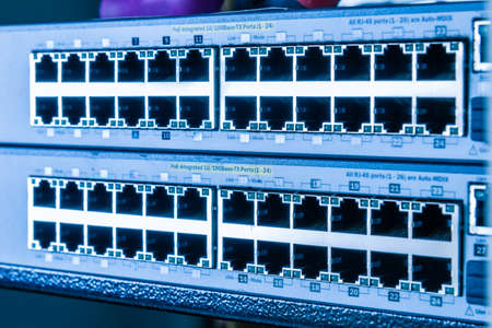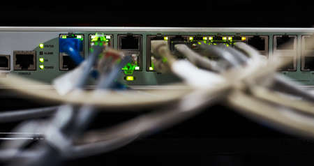 Detail of RJ45 Lan Cables and lights on network switches. Macro Shot