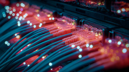 Data center cables connect to switches with bright LEDs, showing hightech connectivity and infrastructure