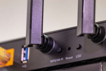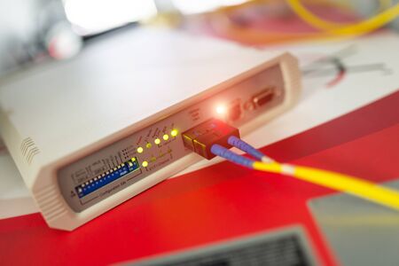Wireless internet router with connected cables, The backside of fiber optic internet, and network cables connected to a router. Internet security and hi-speed concept. Selective focus.. Close-up