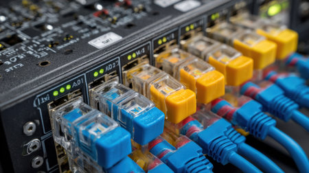 This close-up image showcases a network switch with vibrant Ethernet cables, highlighting the intricate connections essential for data transmission in modern networks.