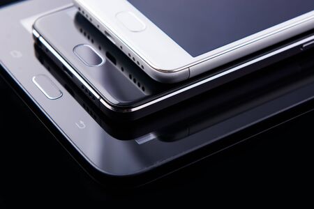 Stack of Modern Smart phones in Various Colors on White Background