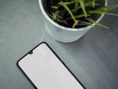 Modern minimalist workspace with black mobile smartphone mockup lies on the surface with a blank screen. Office desk table with a green plant. Top view flat lay closeup on grey marble stone background