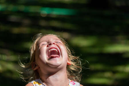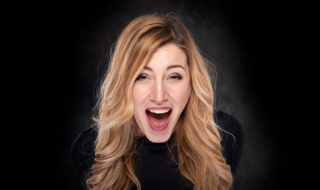 Cheerful woman laughing out loud and enjoying, expression and emotions concept