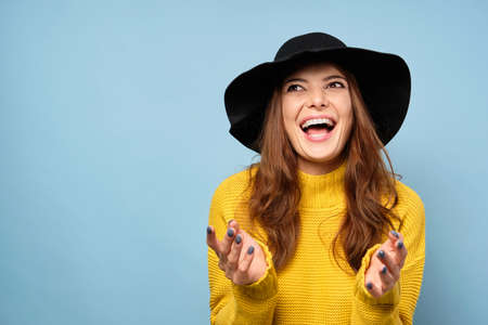 A charming brunette in a yellow sweater and hat stands on a blue background and laughs with his mouth wide open