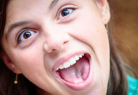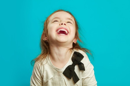 Portrait of a beautiful young girl laughing against a colorful wall.