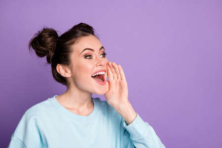 Profile side photo of youngster girl hold hand lips share confidential incredible novelty wear good look clothes isolated over purple color background