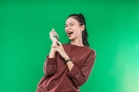 portrait beautiful woman is talking on the phone with someone, expression laugh happily isolated against the green background