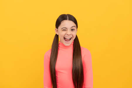 cheerful teen girl in pea dress on yellow background smiling and very happy model in studio
