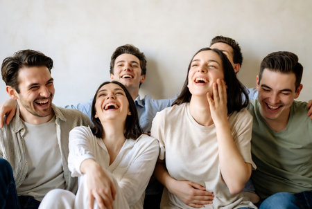 A group of friends smiling and laughing together, with a clean background for text