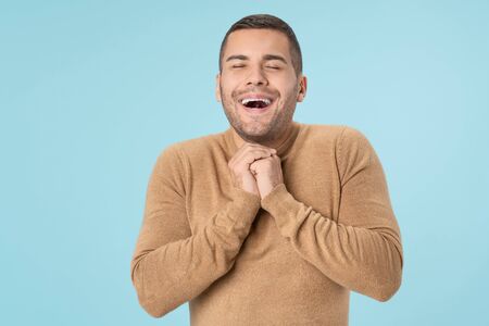 emotion expression lol lmfao. very happy joyful exhilarated man laughing out loud. young handsome bearded hipster guy portrait on blue background.