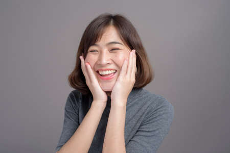 A portrait of young beautiful asian woman over studio background.