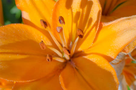 Orange lily flower, blurred background. Pistils and stamens.