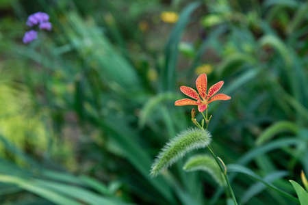 Bright orange lilly flower on green leaves in the garden in spring and summer