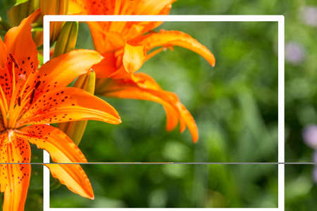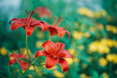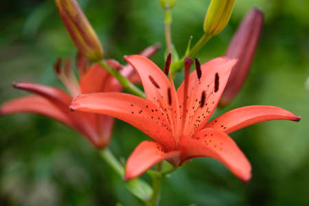 orange flowers of lilies on the blurry green background