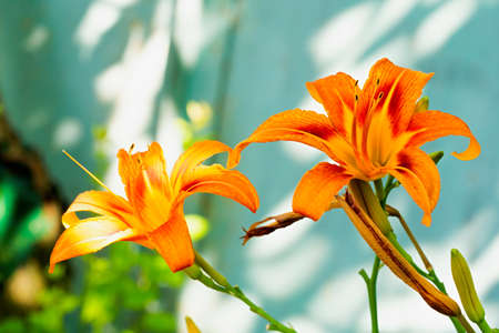 Orange garden lily in front of blue wall. A sunny bright shallow depth of field photo with free blank copy space for text. For cards, posters, website decoration etc.